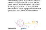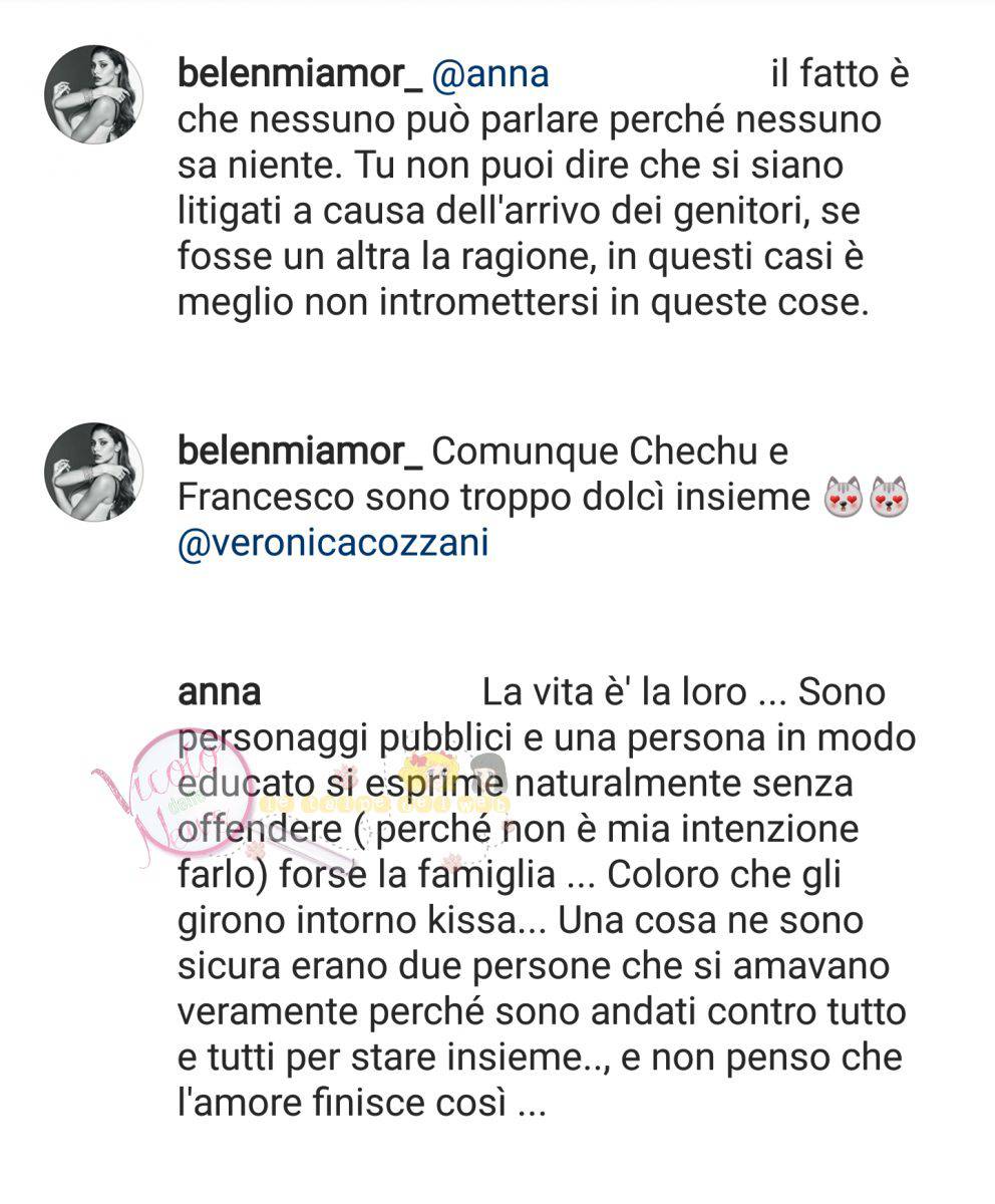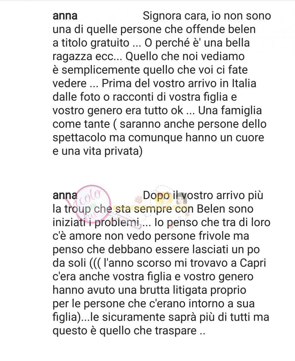 “Peccato che Belen non abbia seguito la sorella dal punto di vista dei sentimenti … Ma abbia preferito mantenere la sua famiglia anziché regalare una famiglia al figlio fatta da mamma e papà… Ancora più dispiacere che la mamma o il padre non gli consiglino di far pace con il marito e non pensare a loro!!!”