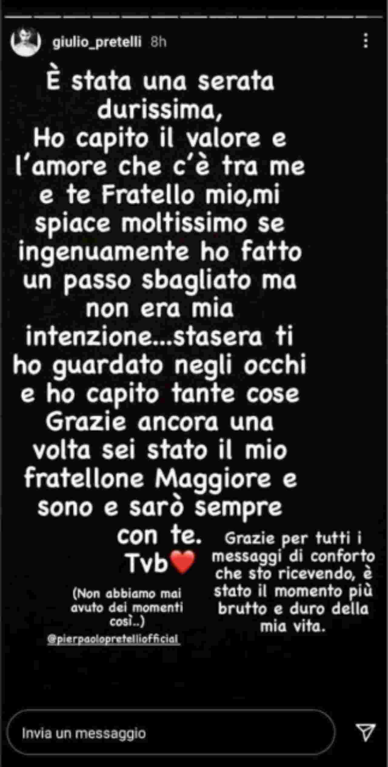 Giulio Pretelli, come anticipato, subito dopo il confronto con suo fratello al Grande Fratello Vip, sul suo profilo Instagram ha provato a spiegare al pubblico del piccolo schermo per quale motivo lui ha agito in quel modo, dispiaciuto di aver litigato con Pierpaolo ma contento di aver chiarito ogni cosa.