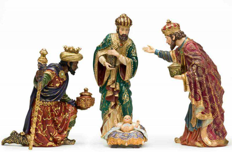 2- Re magi: statuine che rappresentano Gaspare, Melchiorre e Baldassarre. Sono rappresentati con abiti ricchi e reggono i tre doni. Secondo la tradizione, Melchiorre viene rappresentato come anziano, con la barba lunga e portante incenso e proverrebbe dall’Asia. Gaspare è il più giovane dei re e trasporta il simbolo della regalità, ossia l’oro, rappresenta l’Europa. L’ultimo re è Baldassarre ossia il mago dell’Africa, di colore scuro,che porta in dono la mirra. Quest’ultima veniva utilizzata per l’imbalsamazione e dunque a ricordo della futura morte di Cristo.