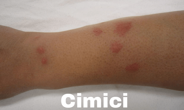 Le cimici possono infestare materassi, e poltrone. Le punture si presentano come tanti pomfi vicini e dall’aspetto di piccole vesciche. Lavare la zona con acqua e sapone e applicare una pomata specifica. Consultare il medico se l’eruzione cutanea non migliora.