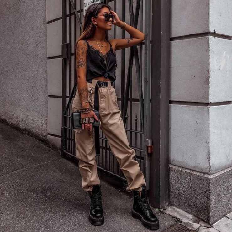 I cargo con la blusa elegante? Vi prego no. Proprio come è labile il confine tra amore ed odio lo è anche tra originalità e “tamarragine”. Si può attirare l’attenzione con gli accessori giusti come una bella cintura in match con la borsa a spalla ma non con pizzo e seta.