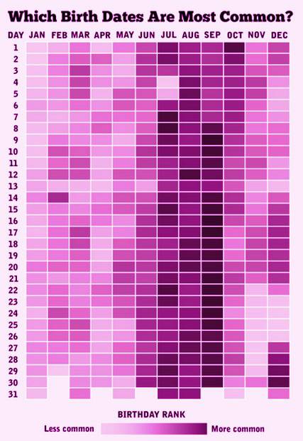 Ci sono giorni in cui sono ovviamente nate più persone, ad altri in cui ne sono nati meno..scopri quanto è diffuso il tuo compleanno consultando lo schema. Se il tuo compleanno è segnalato con un colore chiaro è più raro, se è segnalato con un colore scuro è più diffuso.