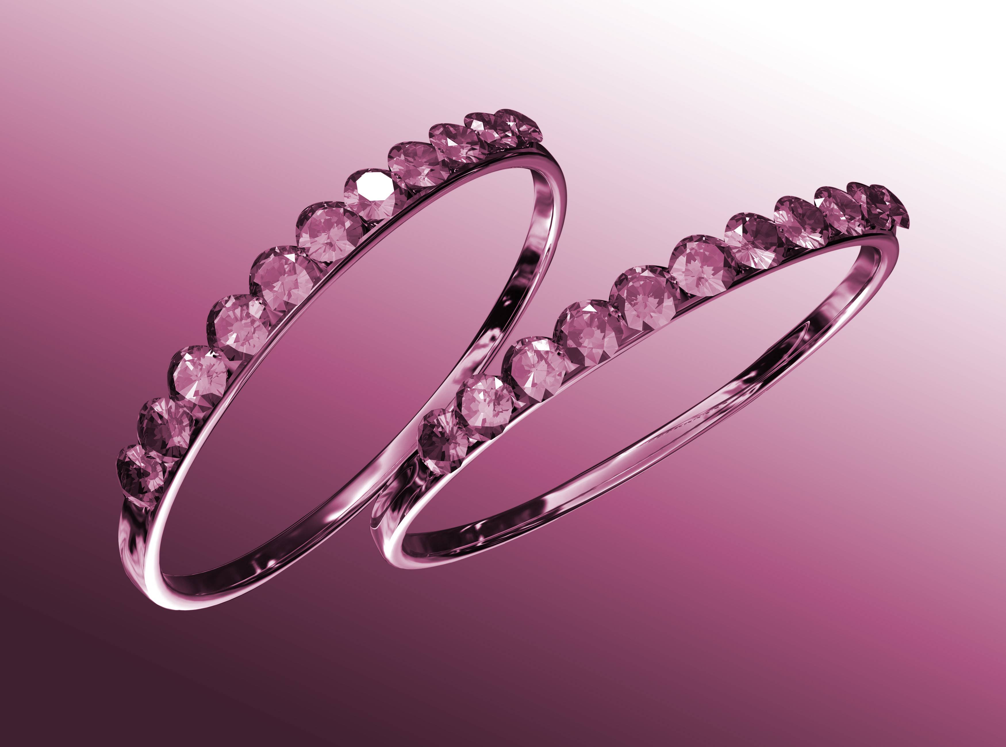 Two rings with diamonds against a pink background