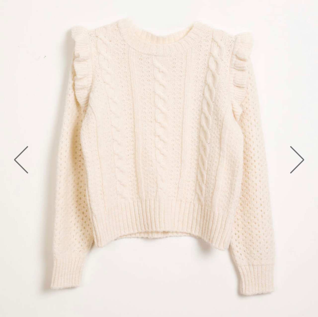 Mentre nella prima immagine c’è la morbida opzione della maglia lilla di Shein ad un prezzo più che conveniente (20 euro), ecco subito dopo la variante good girl, sempre low cost, di Pimkie. Per la modica cifra di 17,99 euro la si può acquistare sul web o prenotarla in negozio. La maglia intrecciata écru è traforata sulle maniche e lavorata sul busto. Adatta alle più romantiche.