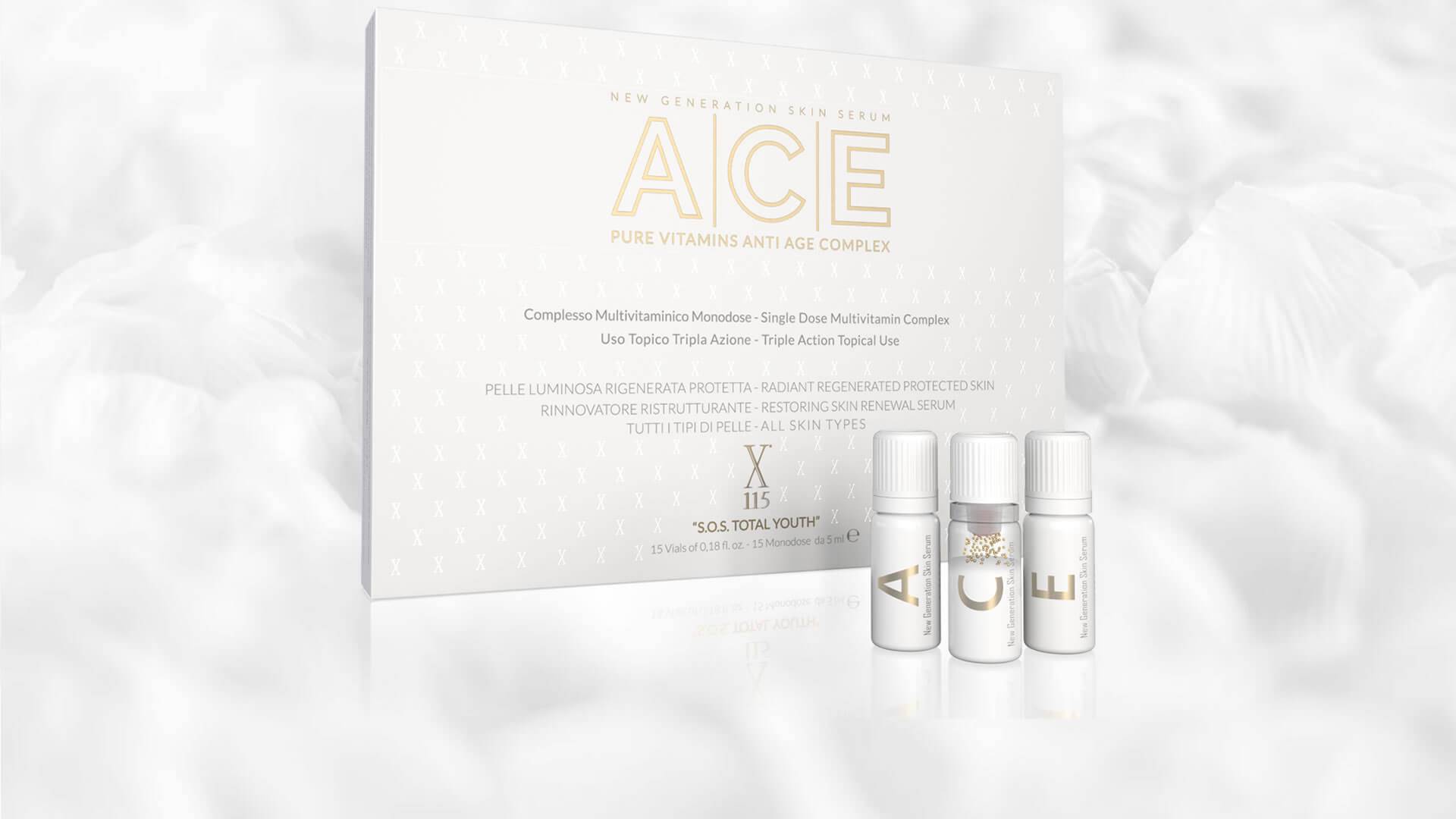 X115 ® ACE è un siero viso contenente 3 formule distinte (A, C ed E) mono-concentrate a utilizzo ciclico.