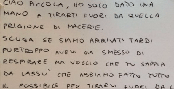 Sul web sta girando una lettera straziante che il Vigile Del Fuoco Andrea ha dedicato alla piccola Giulia, morta sotto le macerie, lettera che è stata posta sopra la bara bianca della piccola, vogliamo proporvela per farvi capire la grandezza di cuore di chi è stato il fulcro di questo disastro.