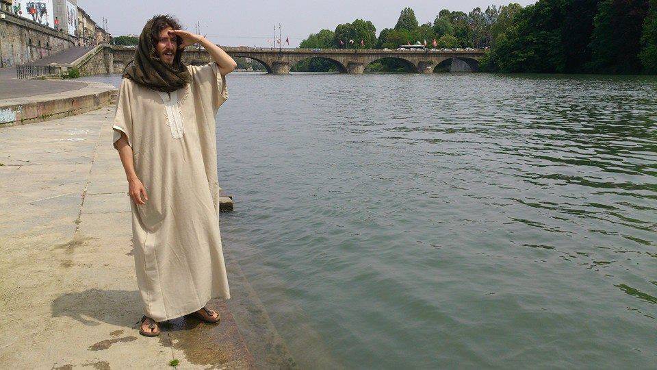 Mentre al Duomo di Torino approdano migliaia di visitatori per vedere la Sacra Sindone, che sarà esposta fino al 24 giugno, per la città sta circolando un uomo, vestito con un saio, il viso scoperto, la testa fasciata da un copricapo e la barba che ricorda tanto il Gesù di Nazareth in versione Franco Zeffirelli.