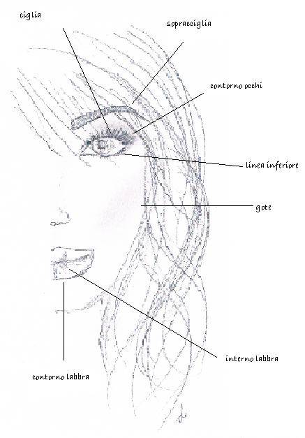 Occhi: applicare un velo si matita del colore che si è scelto per l’ombretto sulla linea superiore dell’occhio (vedi disegno esplicativo), se si vuole allargare lo sguardo, farlo anche sulla linea inferiore, seguendo il perimetro esterno dell’occhio, non interno (in quel caso serve a chiudere un po’ lo sguardo), questa linea deve arrivare fino a metà dell’occhio. Poi prendere il colore desiderato con un pennellino (per il giorno si consigliano colori mat, mentre per la sera, o per le occasioni importanti va bene la perlescenza), seguire la linea prima marcata con la matita, farlo in maniera delicata, in modo da non avere l’effetto “panda”! con lo sfumino poi cerchiamo di ampliare l’ombretto, allungando leggermente il colore verso l’esterno, non esagerando. Una volta applicato il colore principale, prendiamo con un altro pennellino un colore pastello (o perlescente, a seconda dell’effetto desiderato) chiaro, va bene un carne, un bianco pastello, un avorio. Con questo adesso dobbiamo seguire l’arco subito sottostante le sopracciglie, per rendere il colore dell’ombretto messo in precedenza più leggero mano a mano che si arriva all’arcata. Dopo aver finito il lavoro di sfumatura è ora di dare intensità allo sguardo. Questo è possibile grazie al mascara. Per l’applicazione dobbiamo fare attenzione solo a non sporcare il lavoro fatto in precedenza.. Quindi procedere a piccole spennellate, dall’interno verso l’esterno, aiutandosi con la chiusura e l’apertura della palpebra. Più volte ripeteremo il movimento più intenso sarà il nostro sguardo.