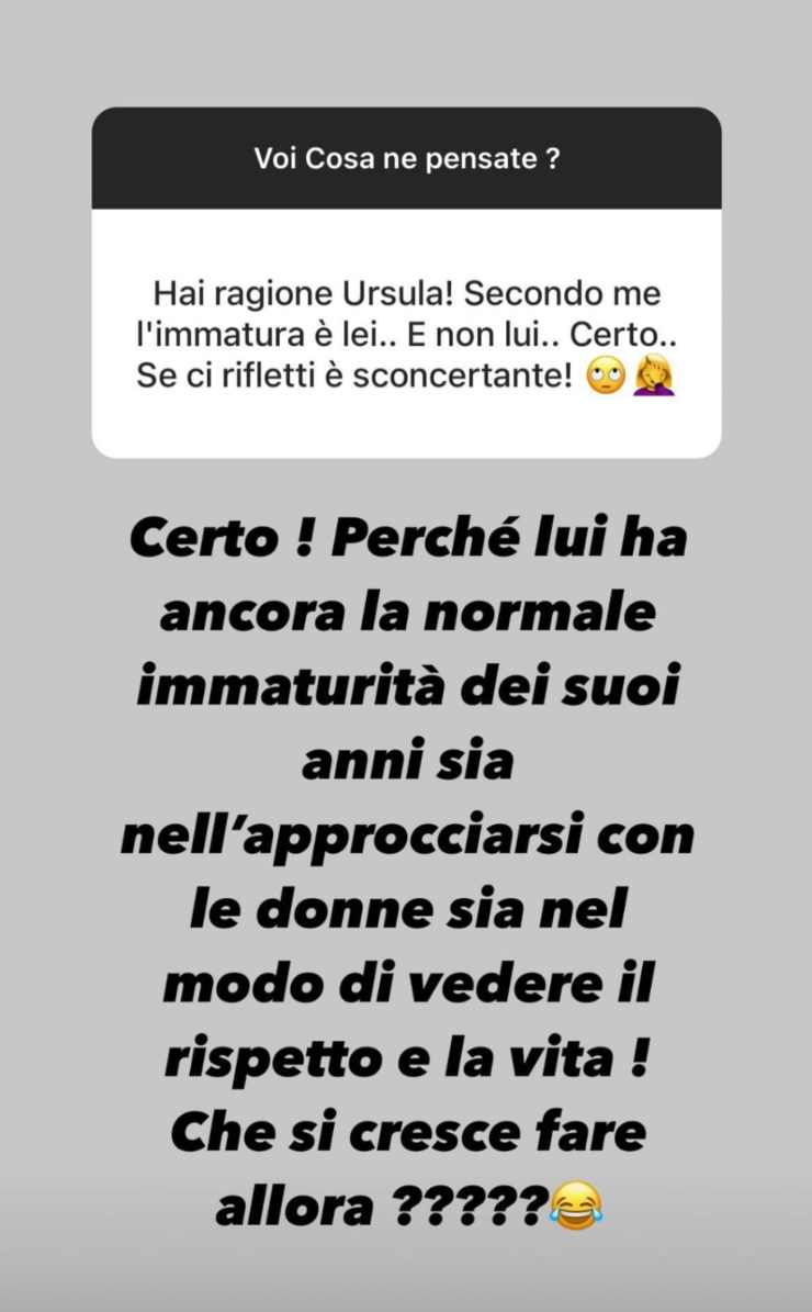Ursula Bennardo ha trovato normale l’atteggiamento di Tommaso, visto che ha soltanto 20 anni ed è comprensibile, secondo il suo punto di vista, che abbia determinati atteggiamenti, mentre non comprende lei che essendo una donna di 39 anni non avrebbe mai dovuto iniziare una relazione con un ragazzo che ha da poco portato a termine la maturità.