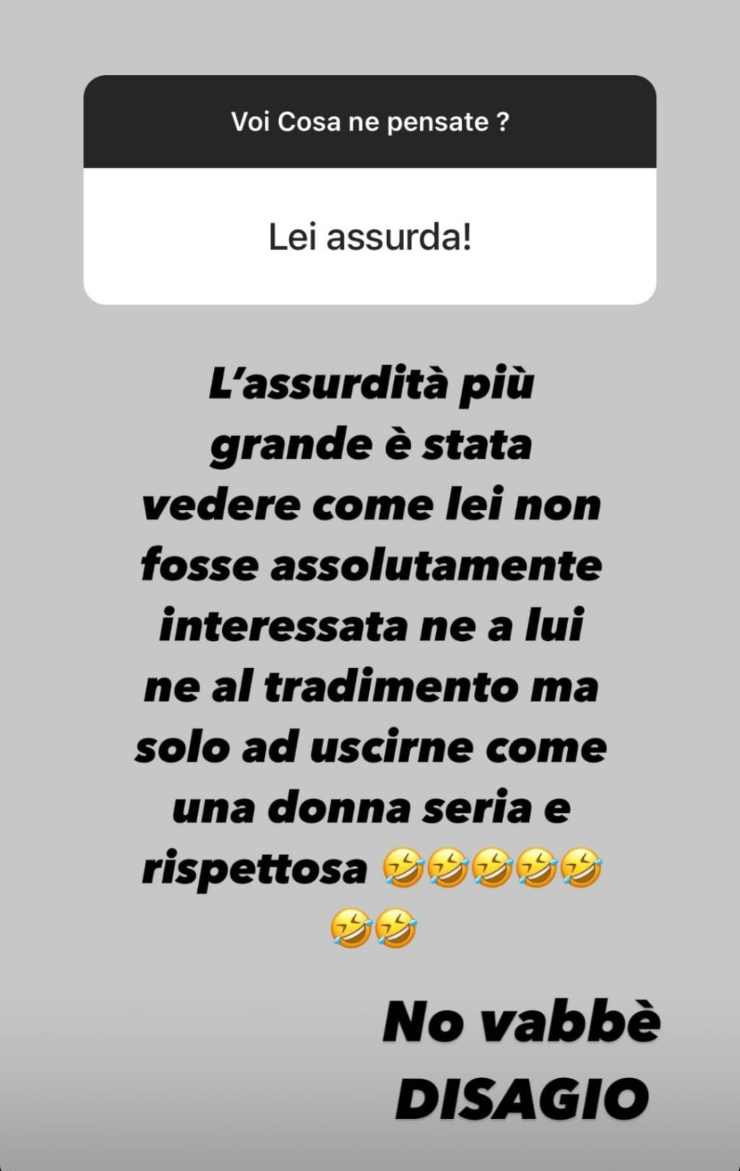 “L’assurdità più grande è stata vedere come lei non fosse assolutamente interessata ne a lui ne al tradimento, ma solo ad uscirne come una donna seria e rispettose. Lui ha ancora la normale immaturità dei suoi anni sia nell’approcciarsi con le donne sia nel modo di vedere il rispetto e la vita. Che si cresce a fare allora?” ha poi concluso.
