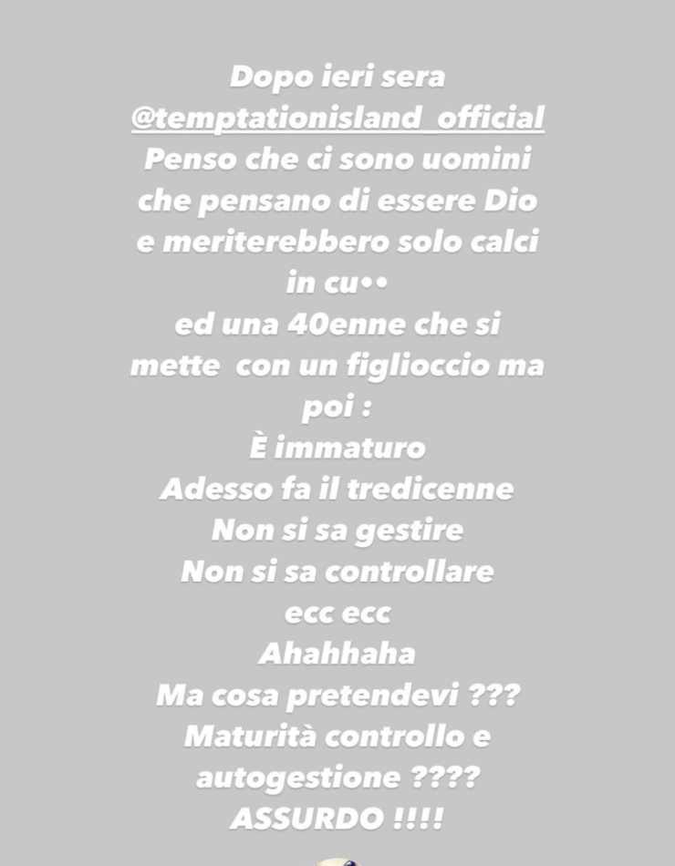 “Dopo la puntata di ieri sera di Temptation Island, sono dell’idea che alcuni uomini si credano Dio e meriterebbero soltanto calci nel sedere ed una 40enne che si mette con un figlioccio ma poi è immaturo. Adesso fa il tredicenne. Non si sa gestire, non si sa controllare. Ma che cosa pretendevi? Maturità ed autocontrollo?” ha esordito la compagna di Sossio Aruta su Instagram.