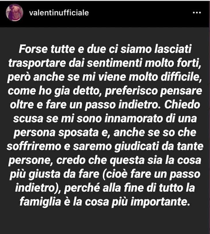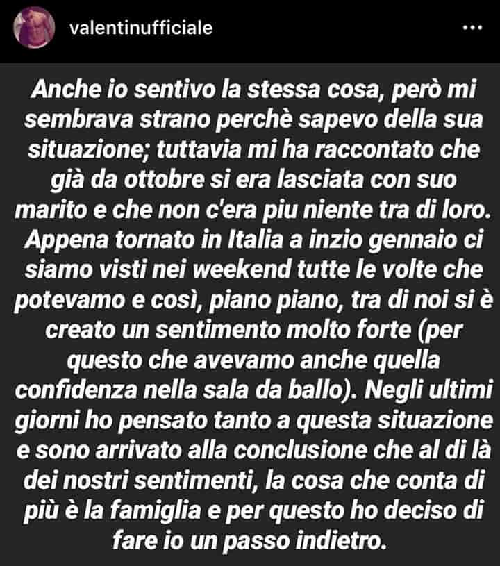 “Chiedo scusa se mi sono innamorato di una persona sposata e, anche se so che soffriremo e saremo giudicati da tante persone, credo che questa sia la cosa più giusta da fare (cioè fare un passo indietro), perché alla fine di tutto la famiglia è la cosa più importante”, ha concluso il ballerino.