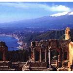 Quando arrivate nel cuore di Taormina, nella piccola piazzetta (di cui abbiamo messo la foto) troviamo una balconata che offre uno dei panorami siciliani più belli. L’Etna, vulcano maestoso e spesso fumante, innevato d’inverno, ed il mare…. Il tutto “condito” da alberi di arance e pale di fichi d’India… Colori, profumi ed emozioni che sono solo in Sicilia.
